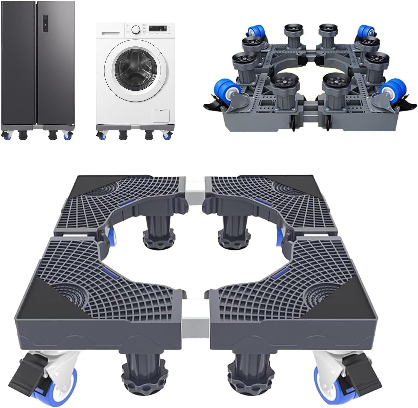 This adjustable appliance stand features a stable stainless steel structure with strong load capacity up to 55.5kg. Its length, width, and height can be customized to keep appliances elevated and dry. Anti-slip and anti-vibration rubber pads reduce noise, while 360° swivel wheels with locks make it easy to install and move. Suitable for washing machines, refrigerators, and other appliances.